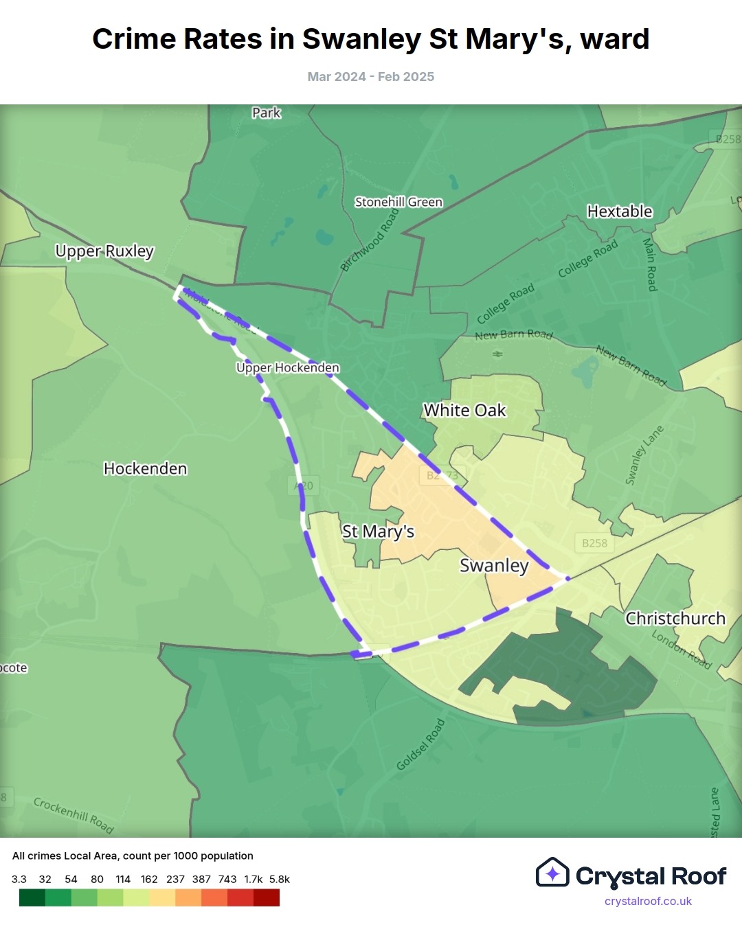 Swanley St Mary's, (ward) includes areas with the following crime ratings (see map):