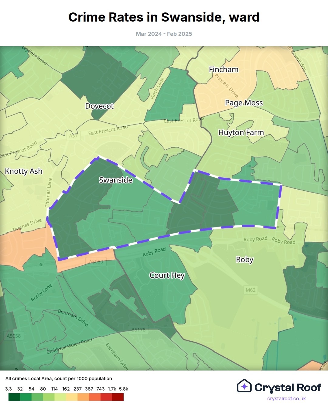 Swanside (ward) is located within Knowsley (borough). Annual total crime rate in Knowsley (borough) is 98.3 crimes per thousand resident population, which can be rated as 4 out of 10 or low crime level compared to other local authority districts in England and Wales.