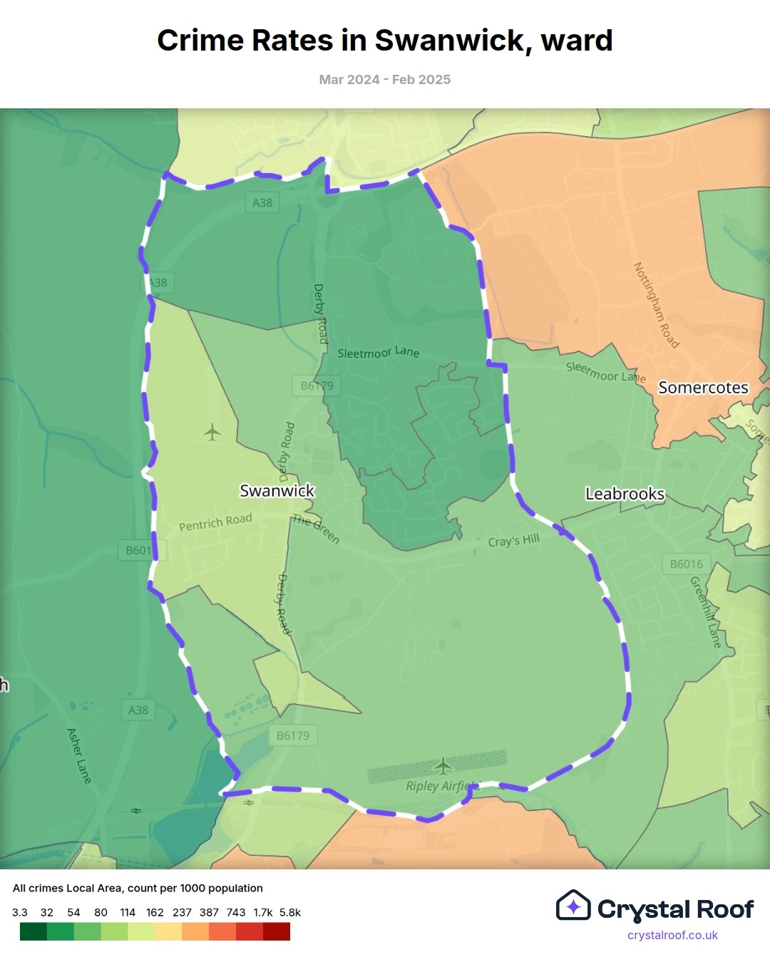 Swanwick (ward) is located within Amber Valley (borough). Annual total crime rate in Amber Valley (borough) is 84.6 crimes per thousand resident population, which can be rated as 3 out of 10 or low crime level compared to other local authority districts in England and Wales.