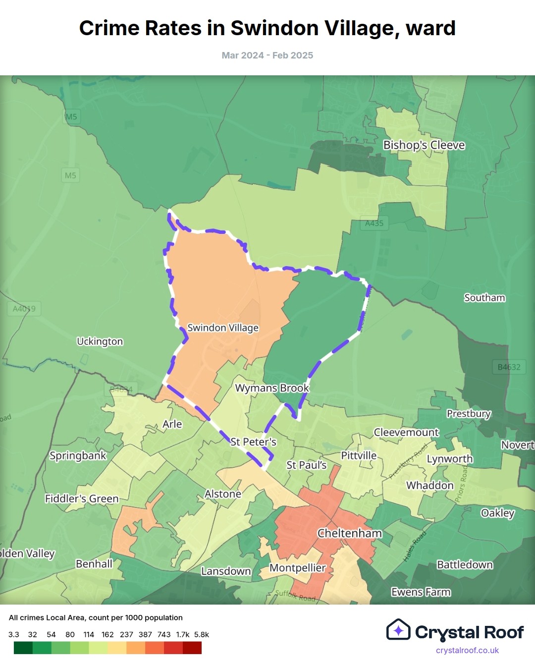 Swindon Village (ward) is located within Cheltenham (borough). Annual total crime rate in Cheltenham (borough) is 107 crimes per thousand resident population, which can be rated as 5 out of 10 or medium crime level compared to other local authority districts in England and Wales.