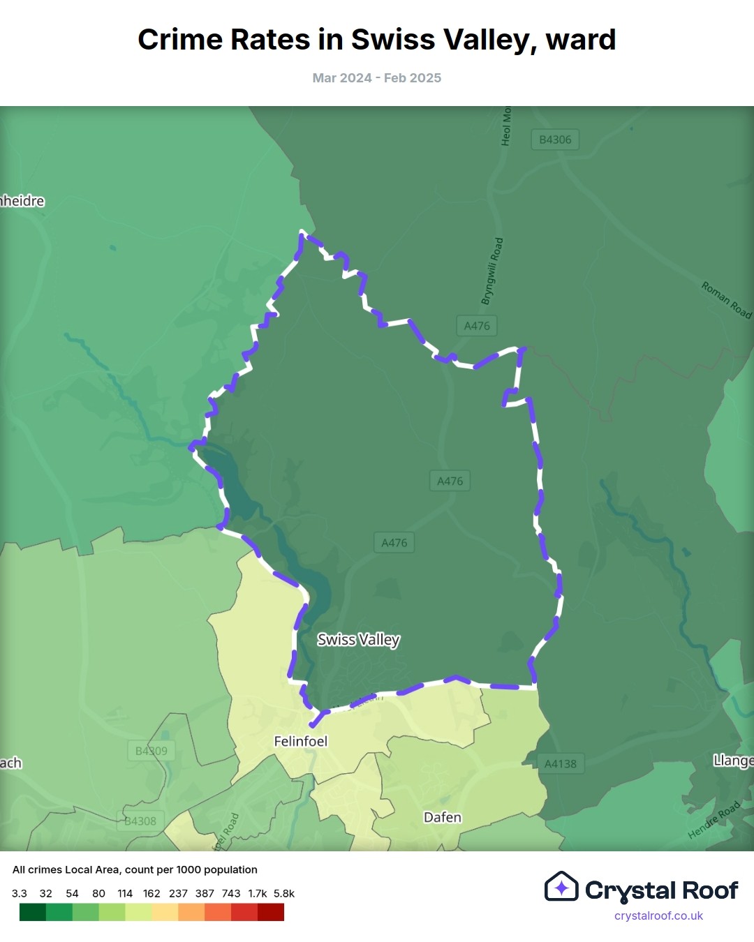 Swiss Valley (ward) is located within Carmarthenshire (borough). Annual total crime rate in Carmarthenshire (borough) is 77.8 crimes per thousand resident population, which can be rated as 3 out of 10 or low crime level compared to other local authority districts in England and Wales.