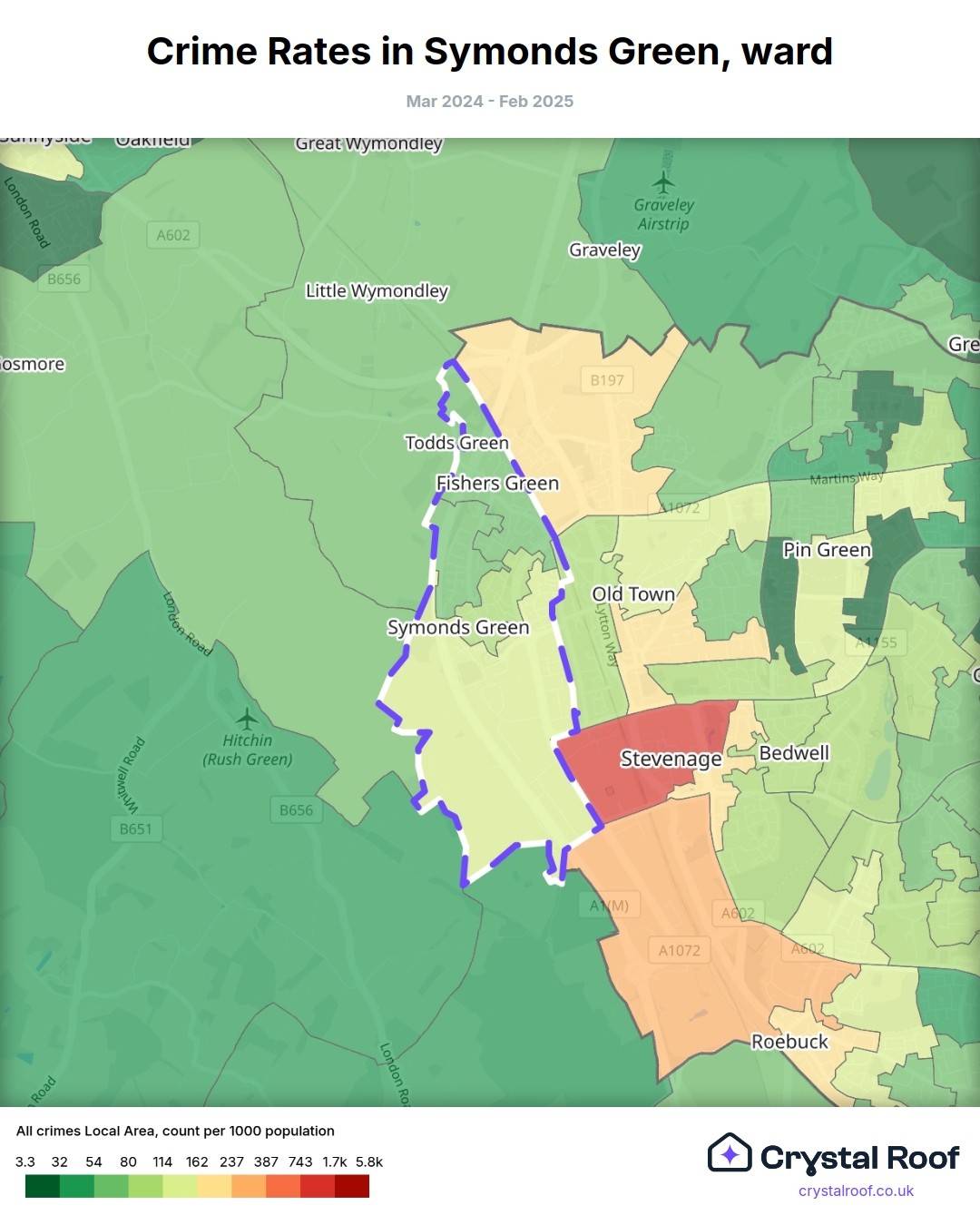 Symonds Green (ward) is located within Stevenage (borough). Annual total crime rate in Stevenage (borough) is 111 crimes per thousand resident population, which can be rated as 5 out of 10 or medium crime level compared to other local authority districts in England and Wales.