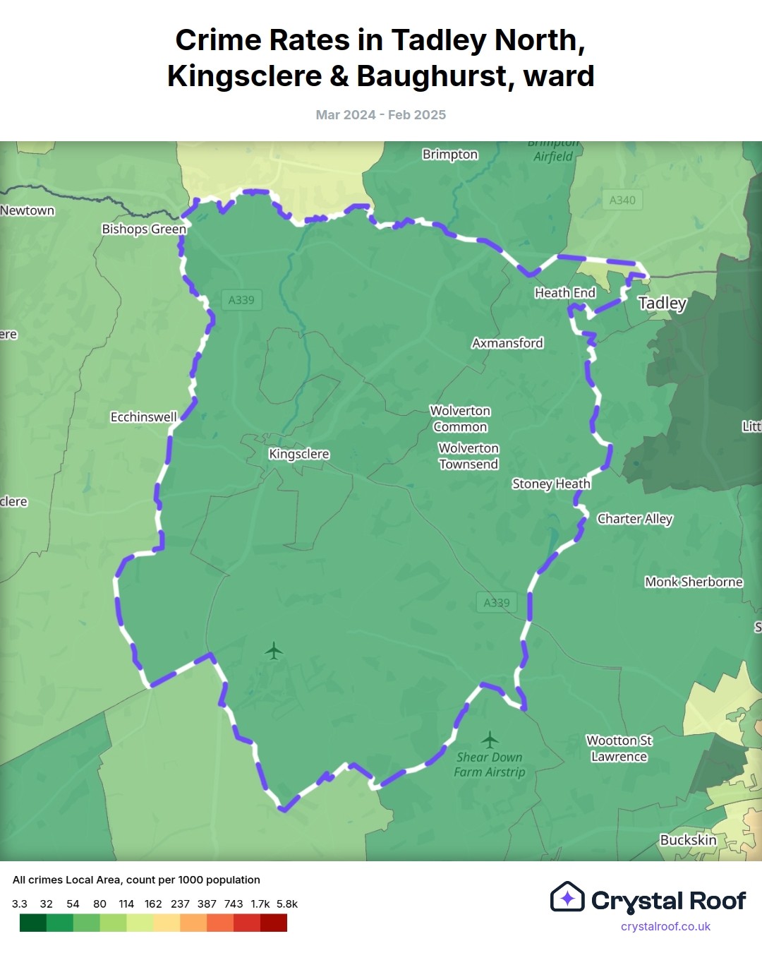 Tadley North, Kingsclere & Baughurst, (ward) includes areas with the following crime ratings (see map):