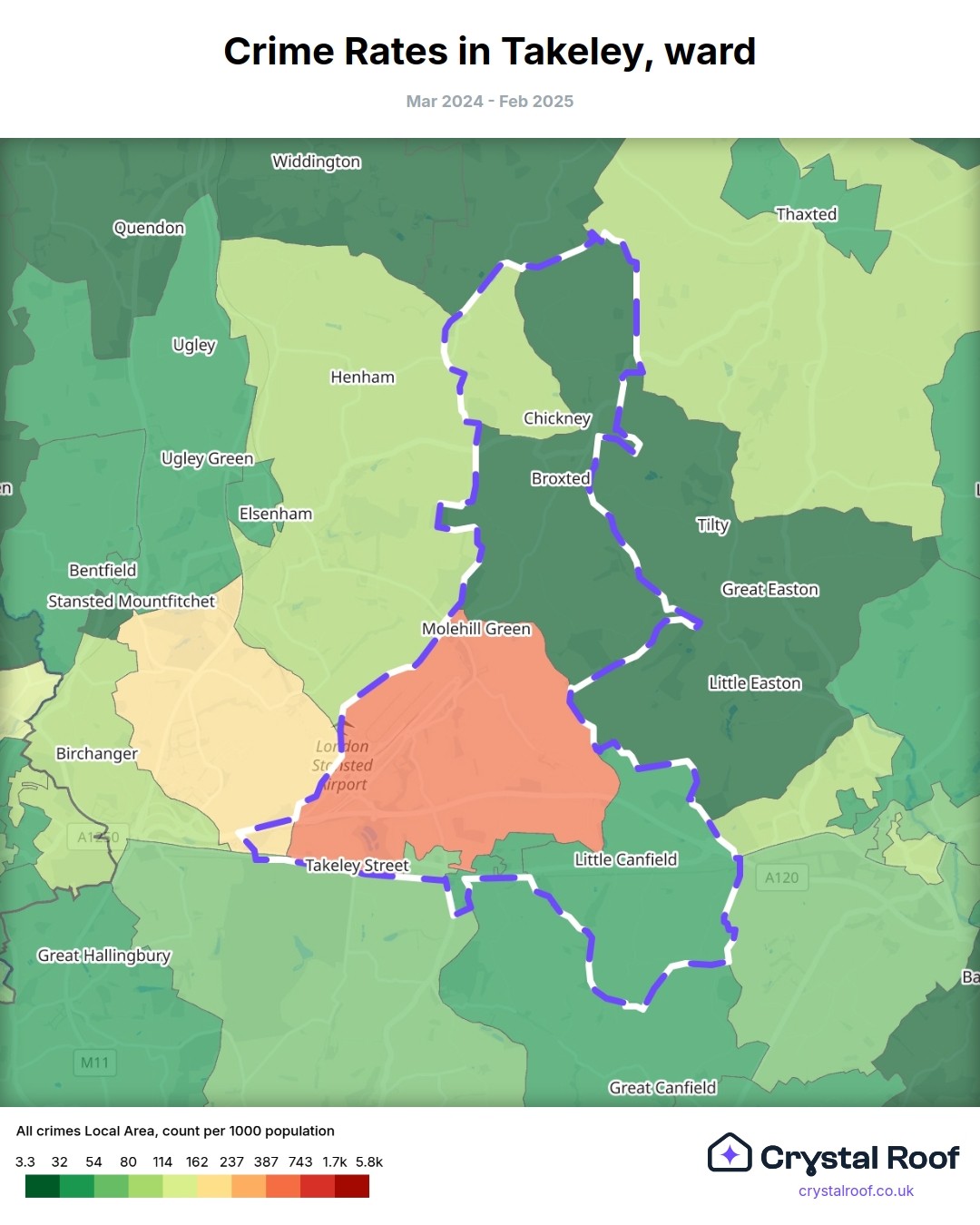 Takeley, (ward) includes areas with the following crime ratings (see map):