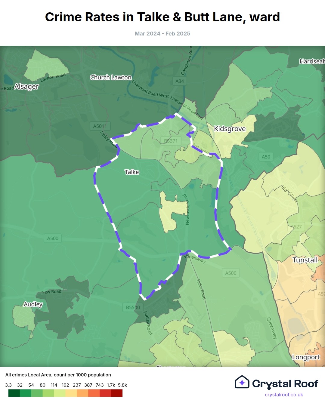 Talke & Butt Lane, (ward) includes areas with the following crime ratings (see map):