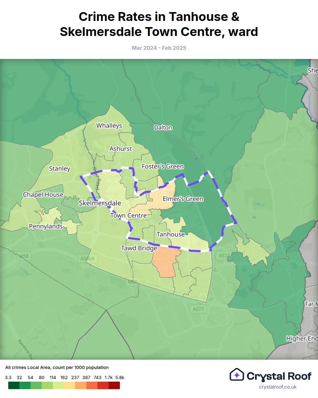 Tanhouse & Skelmersdale Town Centre, (ward) includes areas with the following crime ratings (see map):