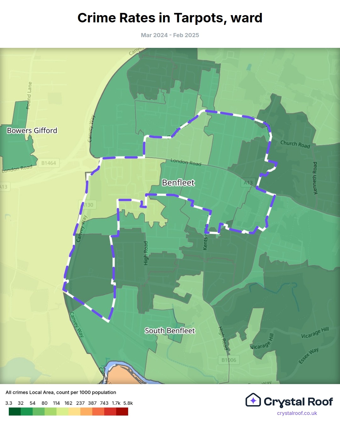 Tarpots (ward) is located within Castle Point (borough). Annual total crime rate in Castle Point (borough) is 61.2 crimes per thousand resident population, which can be rated as 2 out of 10 or low crime level compared to other local authority districts in England and Wales.