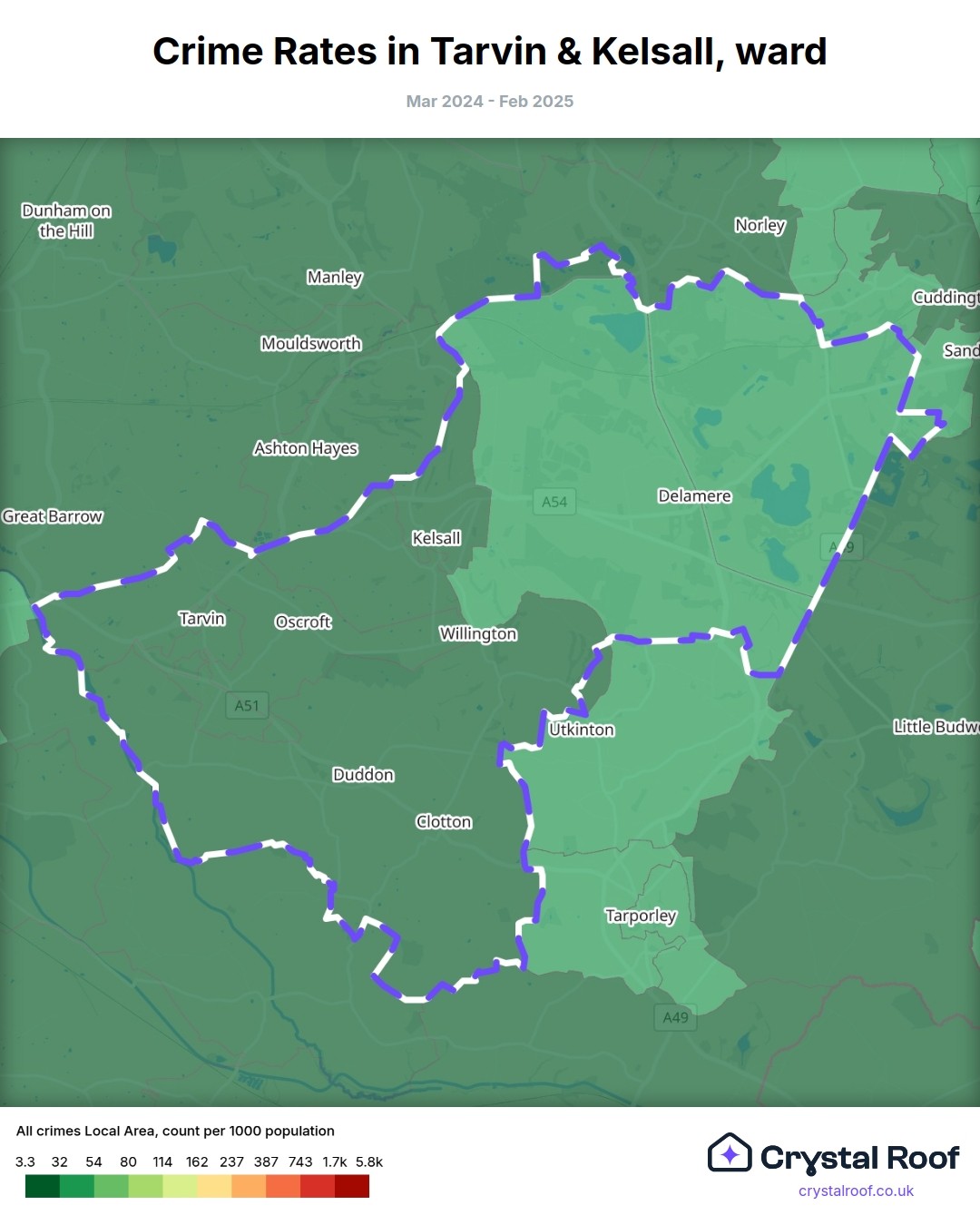 Tarvin & Kelsall, (ward) includes areas with the following crime ratings (see map):