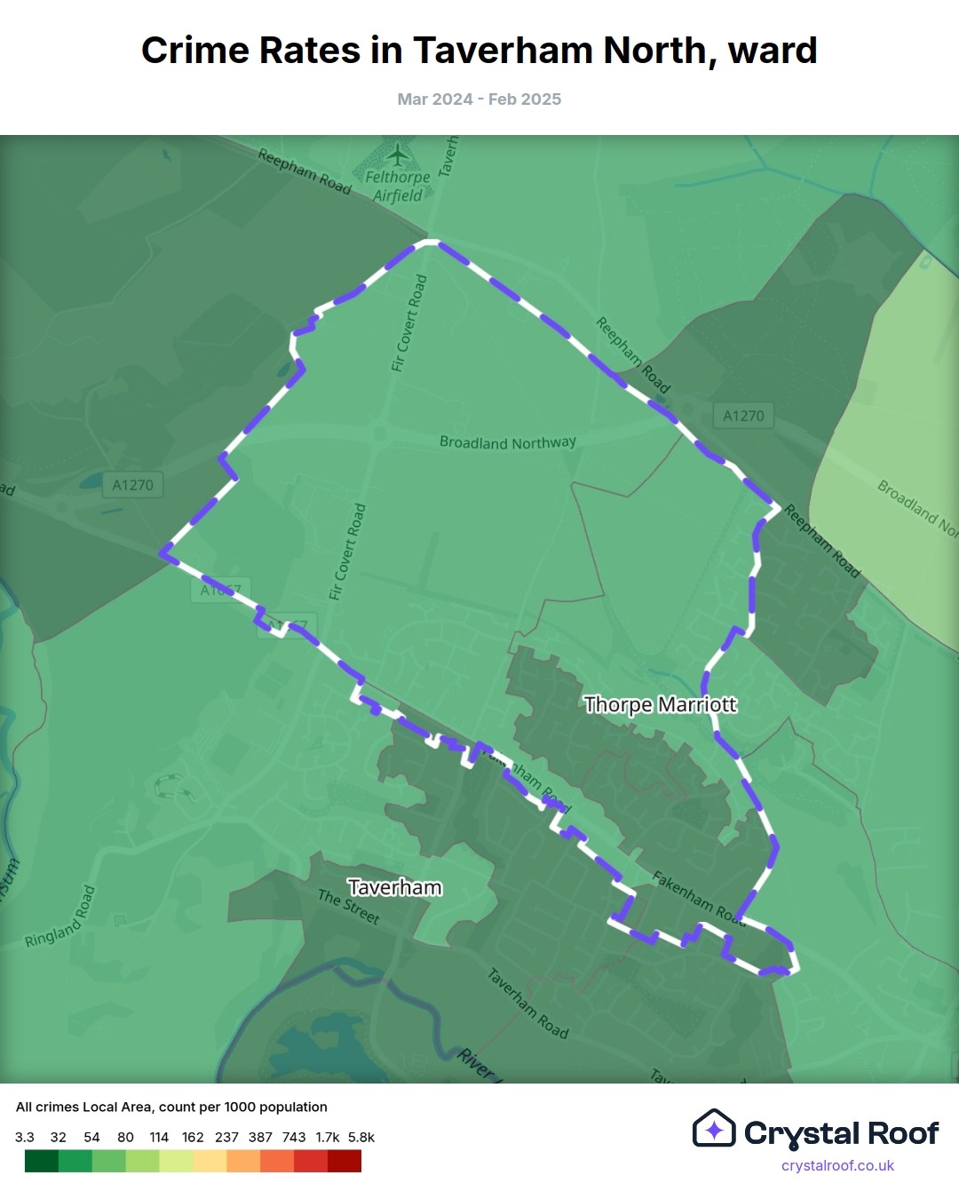 The figures in grey indicate the relative ratings of Taverham North (ward) for a specific crime type compared to other wards in England and Wales.