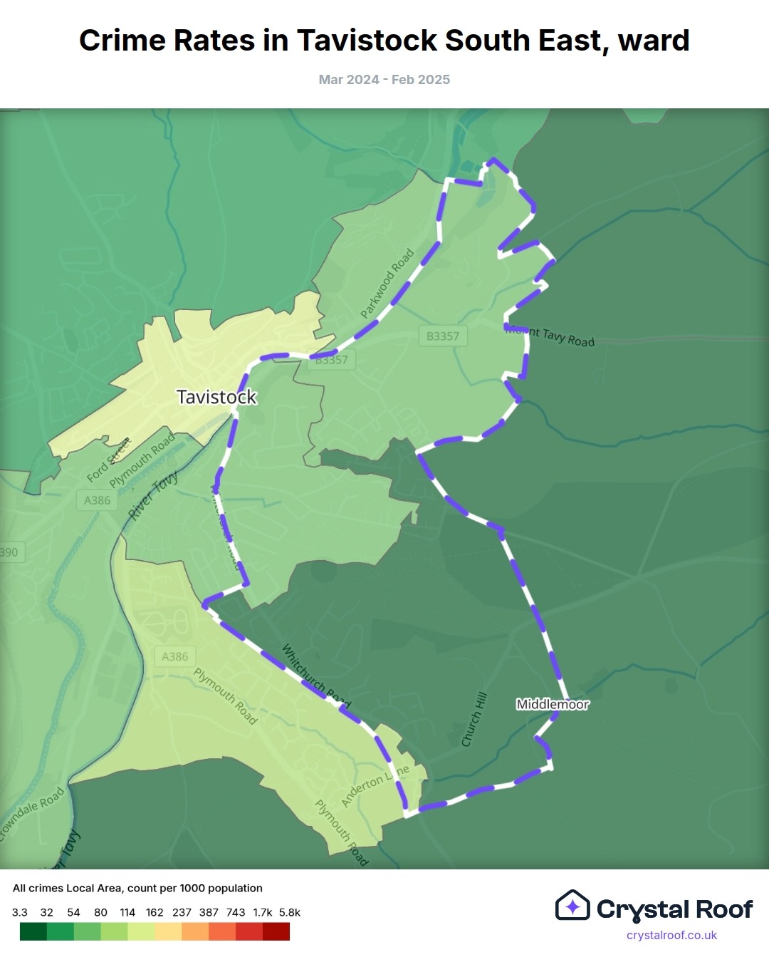 Tavistock South East, (ward) includes areas with the following crime ratings (see map):
