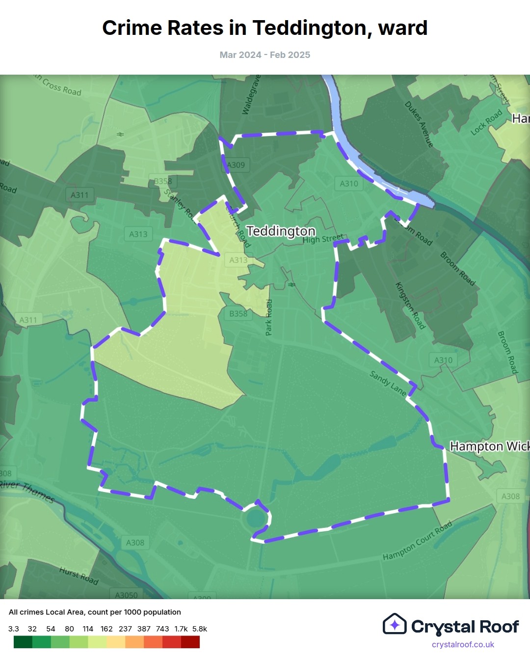 Teddington, (ward) includes areas with the following crime ratings (see map):