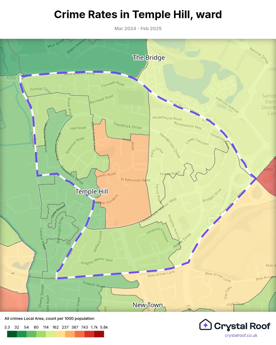 Temple Hill, (ward) includes areas with the following crime ratings (see map):