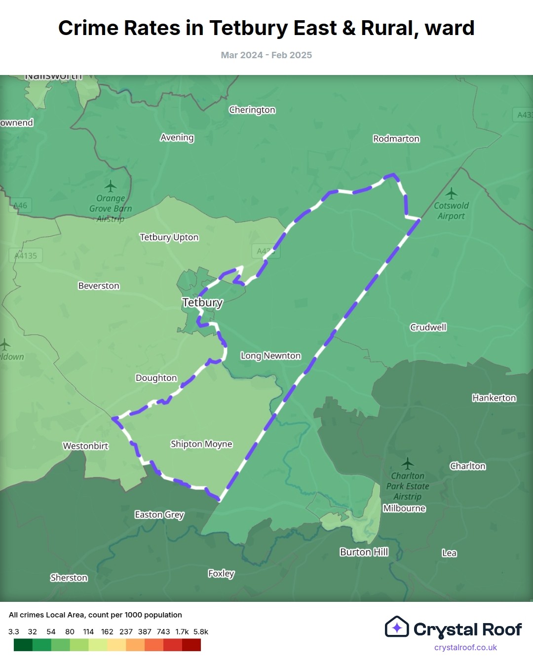 Tetbury East & Rural, (ward) includes areas with the following crime ratings (see map):