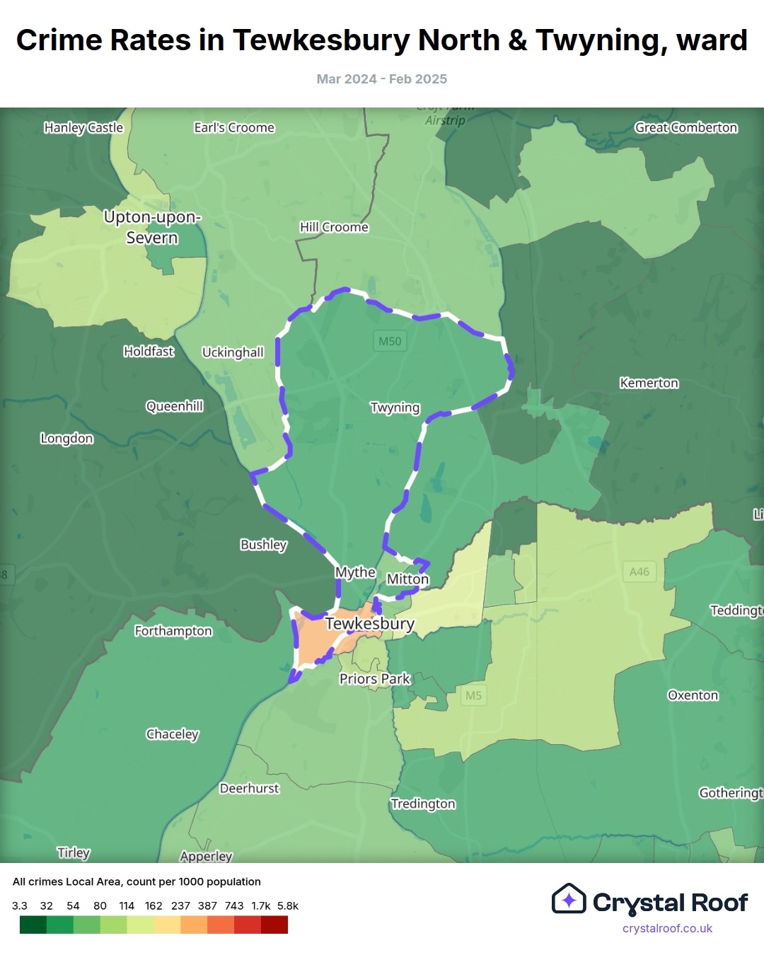 Tewkesbury North & Twyning, (ward) includes areas with the following crime ratings (see map):