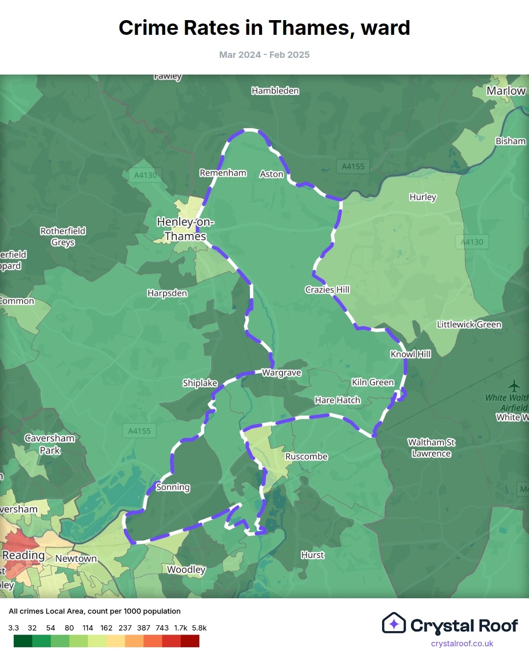 The figures in grey indicate the relative ratings of Thames (ward) for a specific crime type compared to other wards in England and Wales.