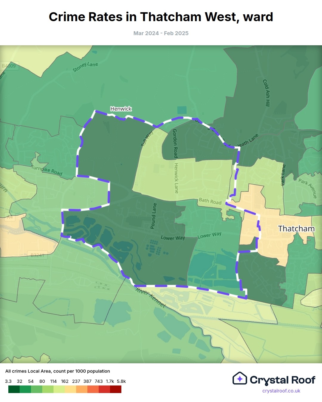 The figures in grey indicate the relative ratings of Thatcham West (ward) for a specific crime type compared to other wards in England and Wales.