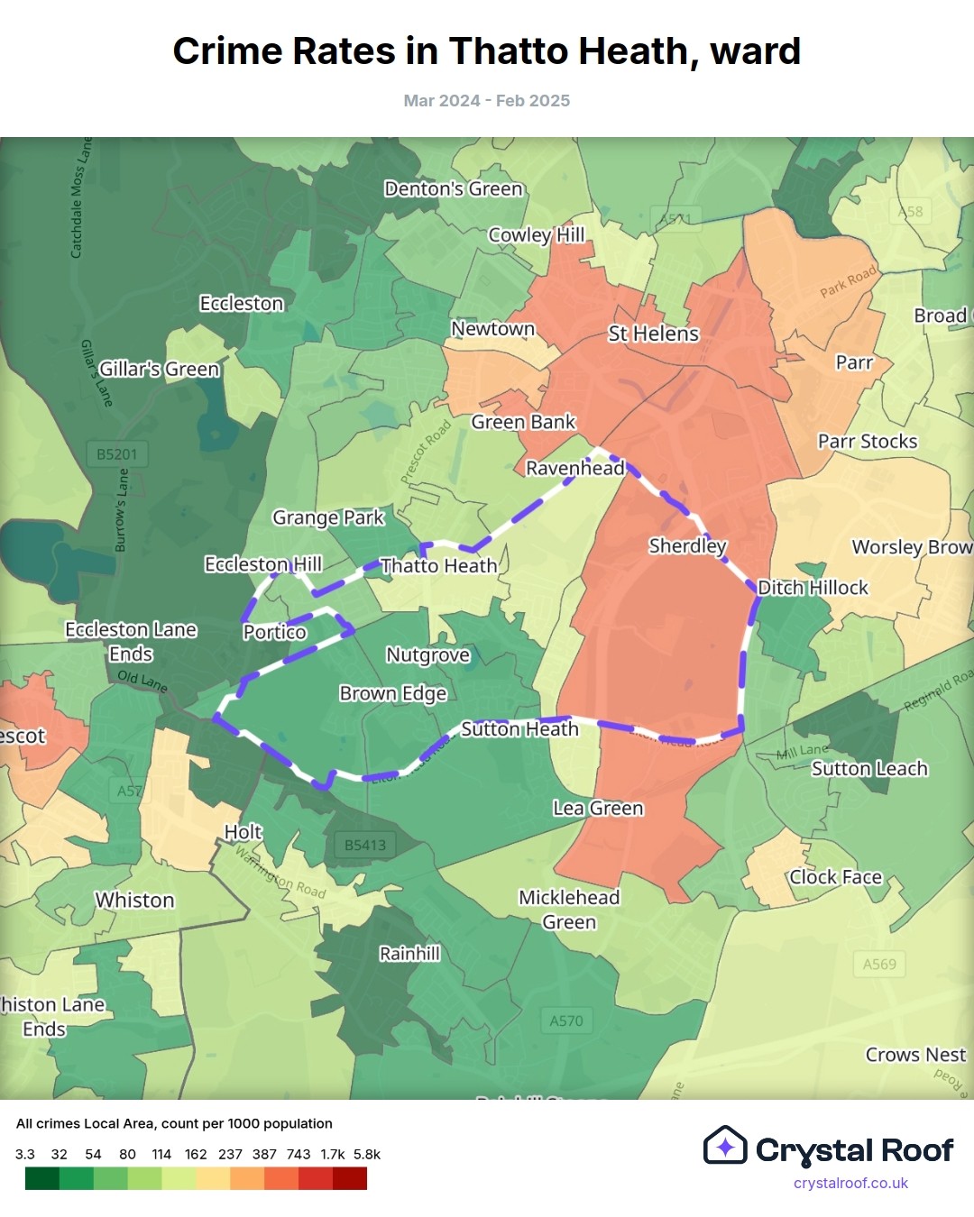 Thatto Heath, (ward) includes areas with the following crime ratings (see map):