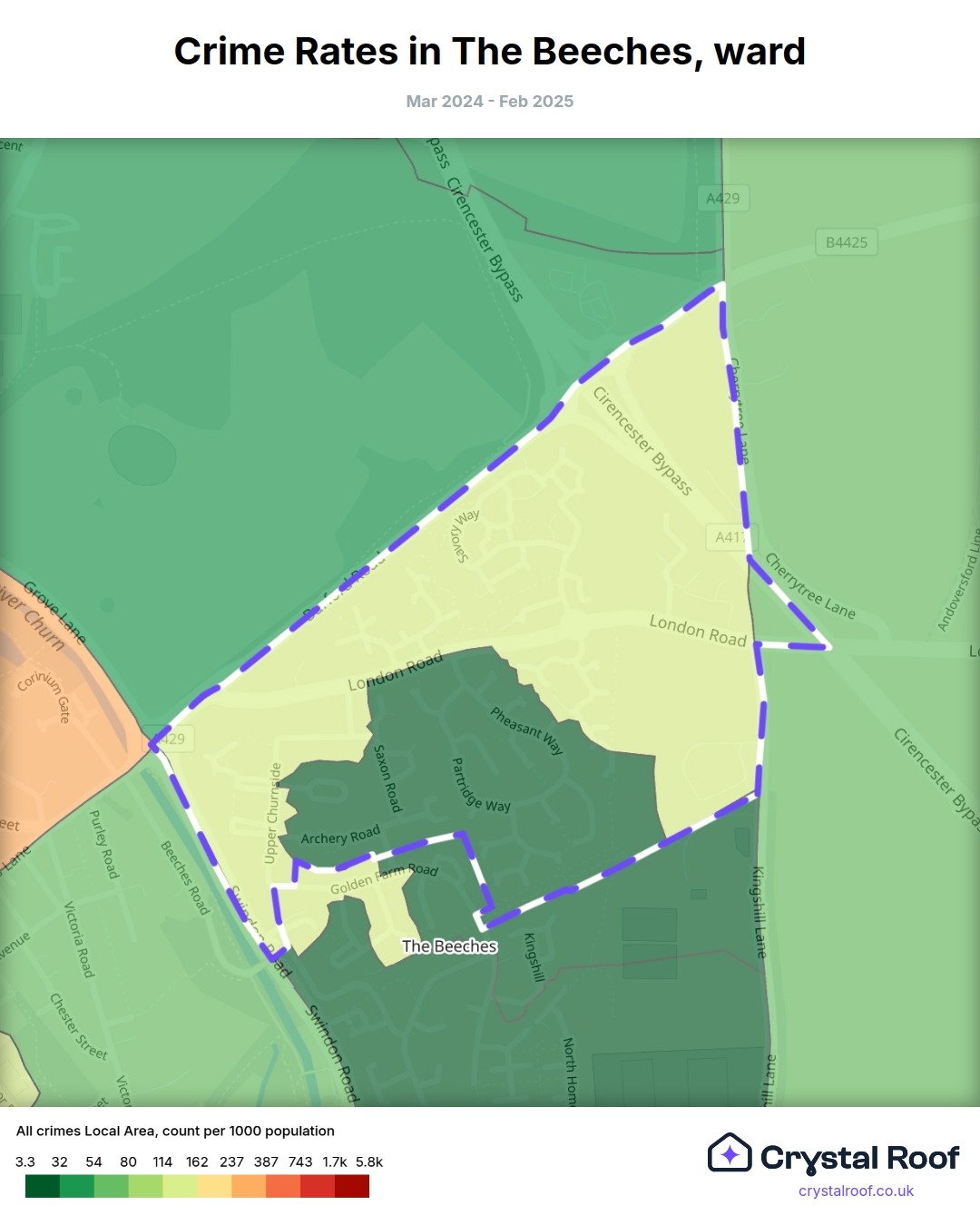 The Beeches (ward) is located within Cotswold (borough). Annual total crime rate in Cotswold (borough) is 58.6 crimes per thousand resident population, which can be rated as 2 out of 10 or low crime level compared to other local authority districts in England and Wales.