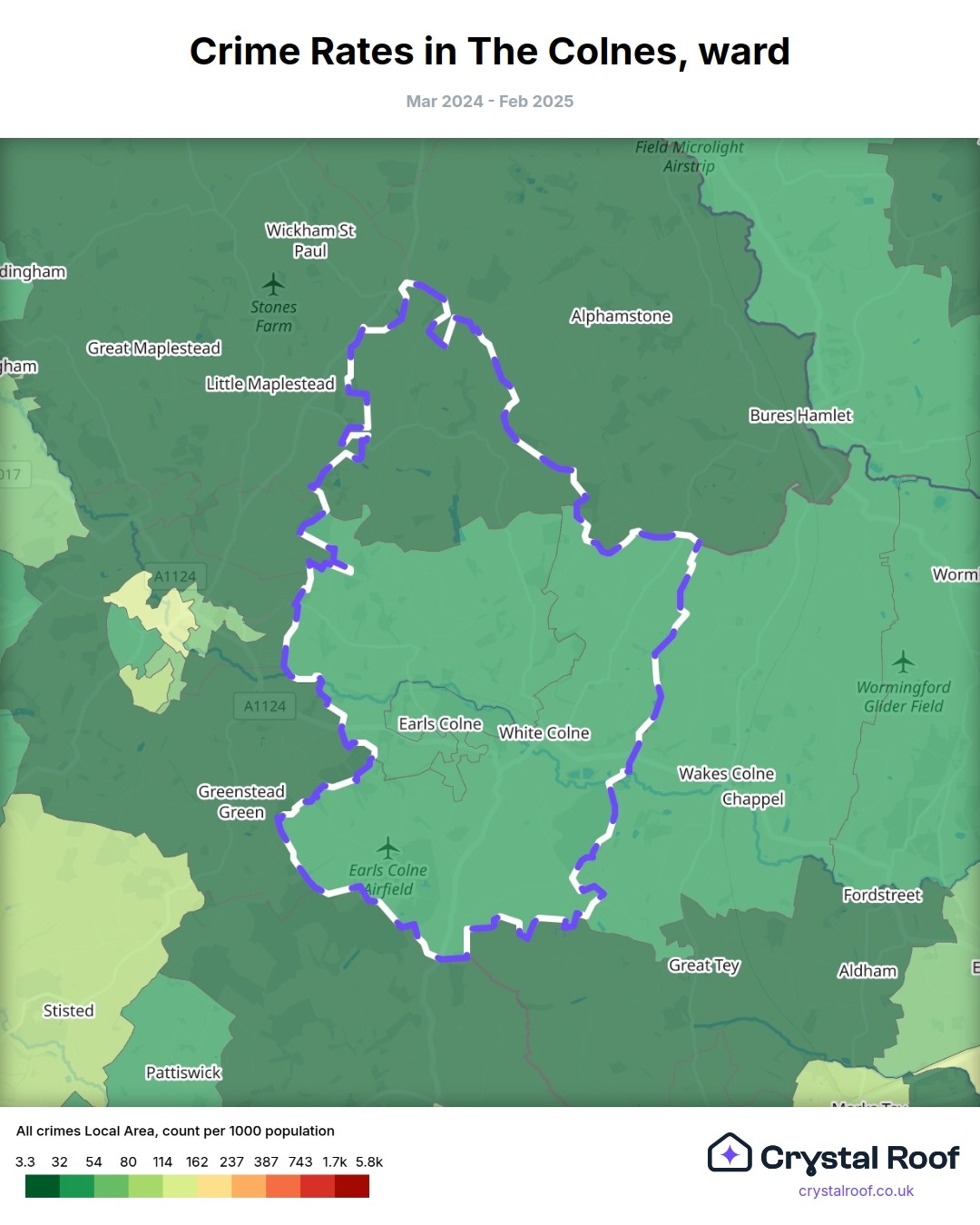 The Colnes (ward) is located within Braintree (borough). Annual total crime rate in Braintree (borough) is 65.6 crimes per thousand resident population, which can be rated as 2 out of 10 or low crime level compared to other local authority districts in England and Wales.