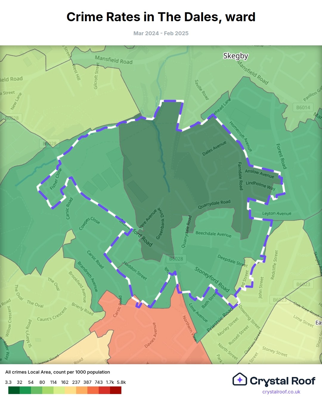 The Dales, (ward) includes areas with the following crime ratings (see map):