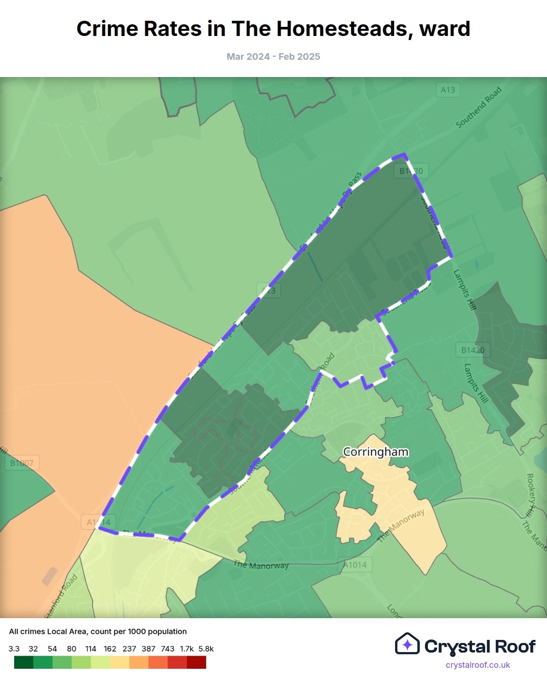 The Homesteads, (ward) includes areas with the following crime ratings (see map):