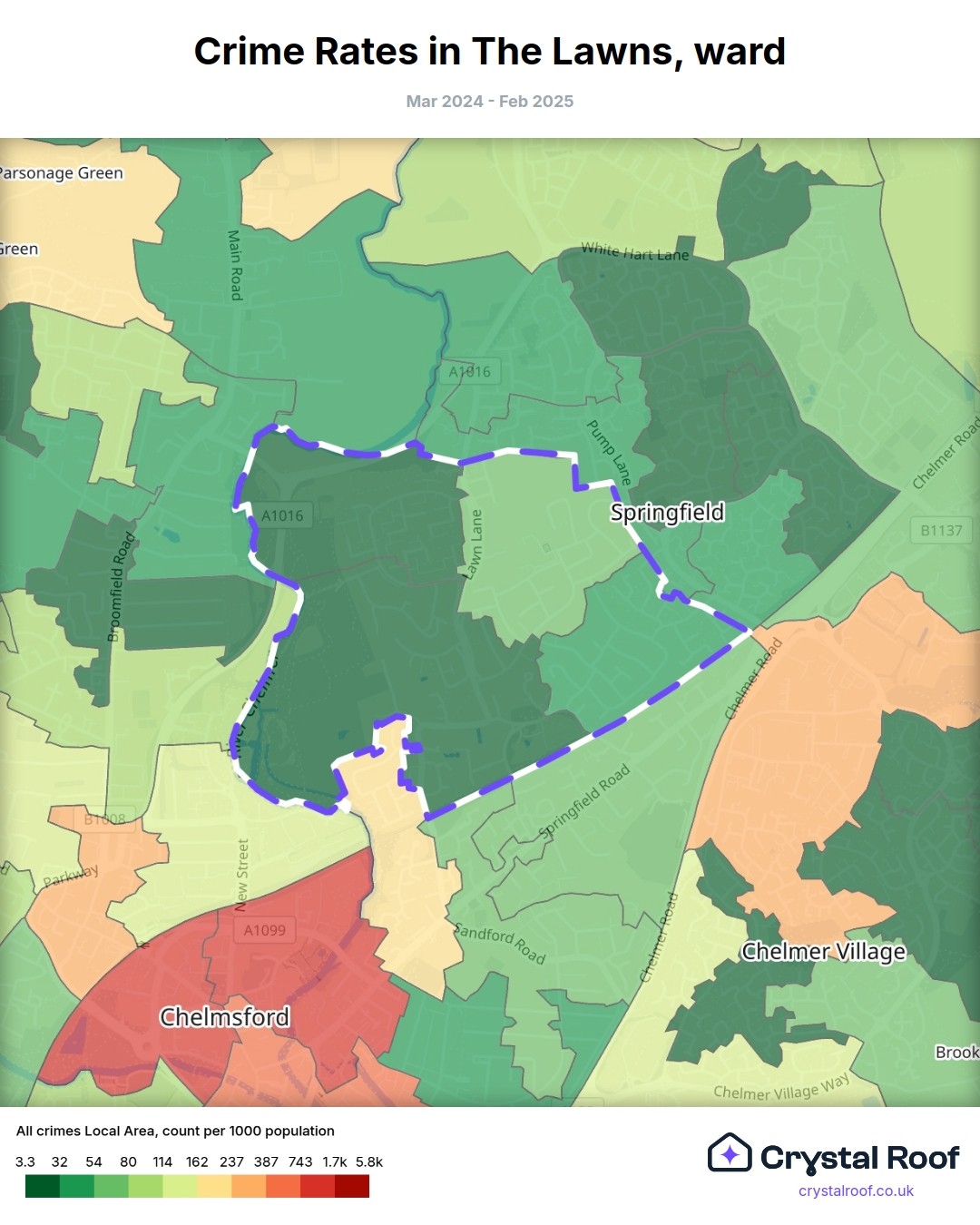The Lawns (ward) is located within Chelmsford (borough). Annual total crime rate in Chelmsford (borough) is 80.7 crimes per thousand resident population, which can be rated as 3 out of 10 or low crime level compared to other local authority districts in England and Wales.