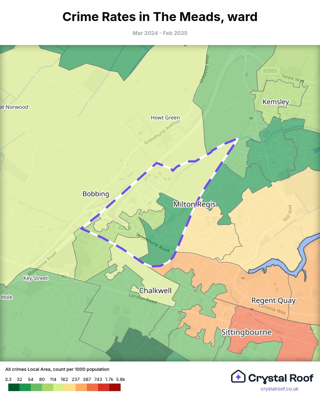 The Meads (ward) is located within Swale (borough). Annual total crime rate in Swale (borough) is 109 crimes per thousand resident population, which can be rated as 5 out of 10 or medium crime level compared to other local authority districts in England and Wales.