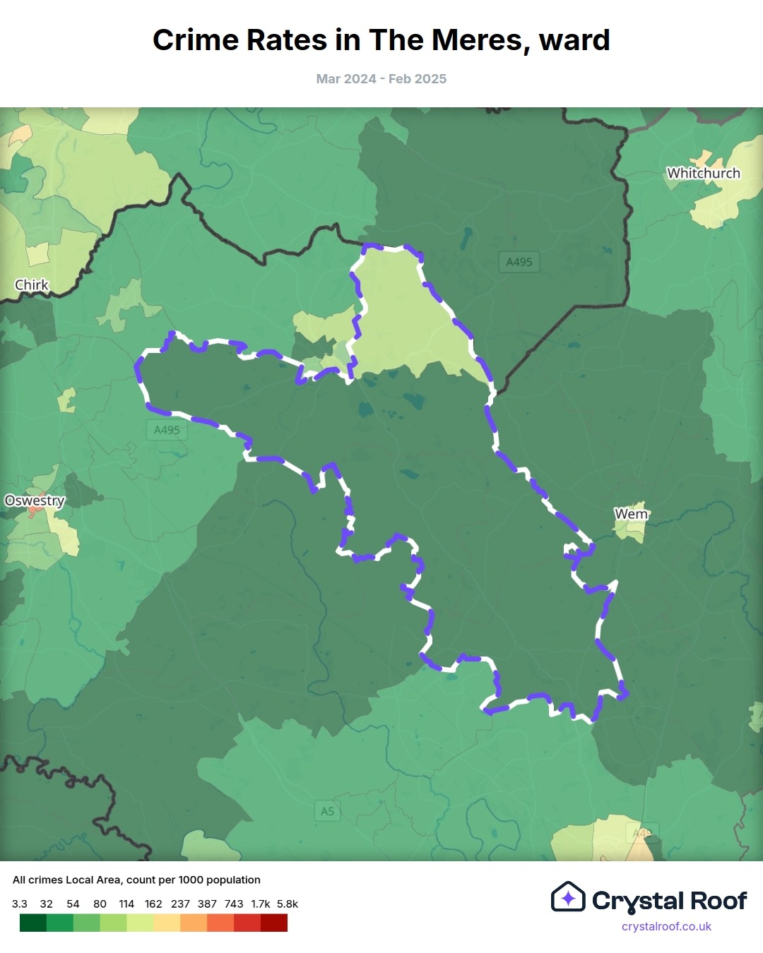 The Meres (ward) is located within Shropshire (borough). Annual total crime rate in Shropshire (borough) is 62.3 crimes per thousand resident population, which can be rated as 2 out of 10 or low crime level compared to other local authority districts in England and Wales.
