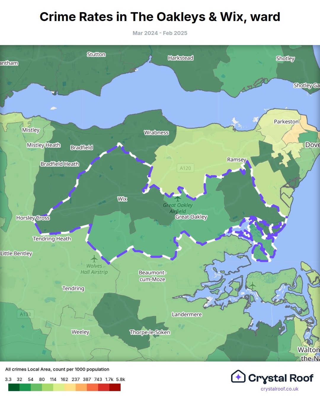 The Oakleys & Wix, (ward) includes areas with the following crime ratings (see map):
