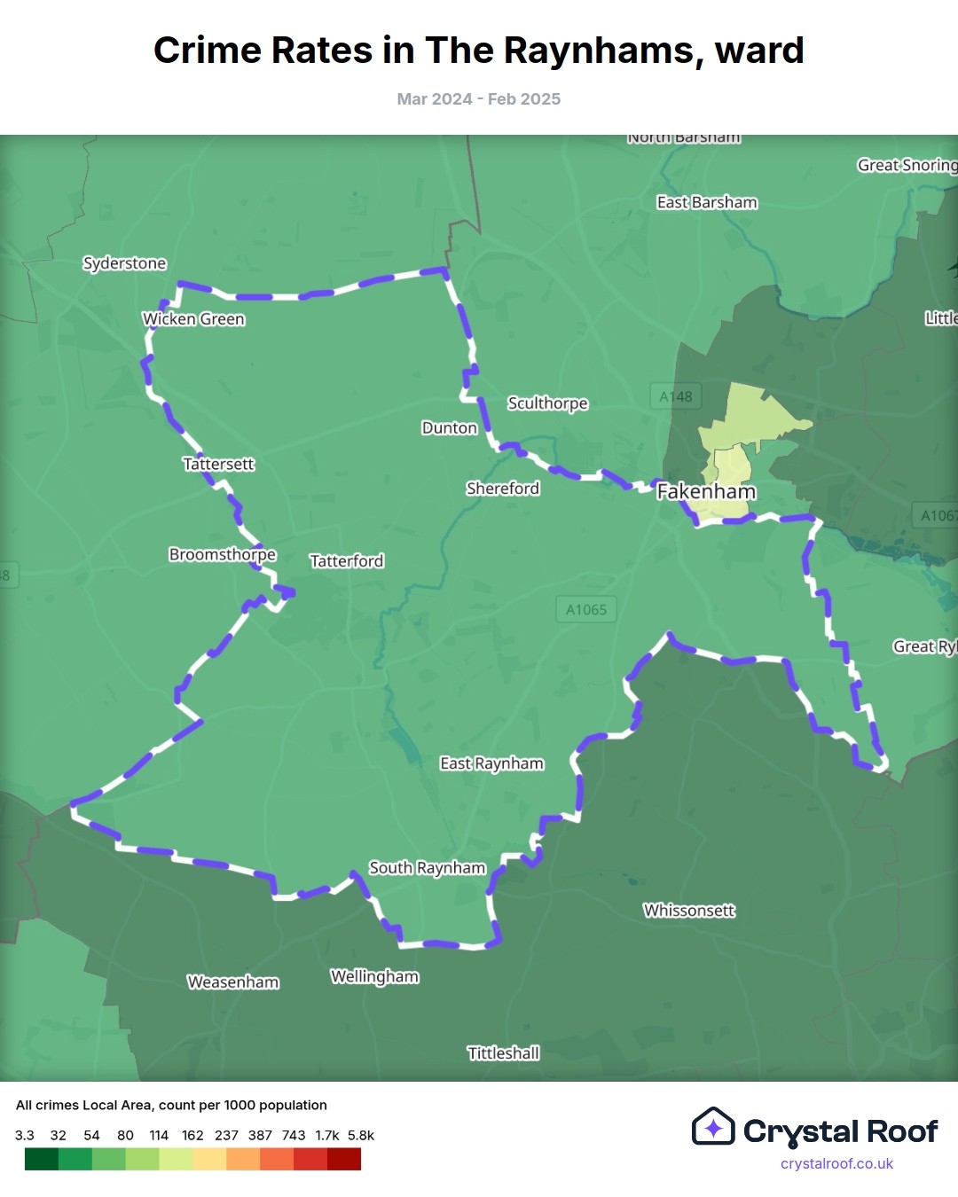 The Raynhams (ward) is located within North Norfolk (borough). Annual total crime rate in North Norfolk (borough) is 46.6 crimes per thousand resident population, which can be rated as 1 out of 10 or low crime level compared to other local authority districts in England and Wales.