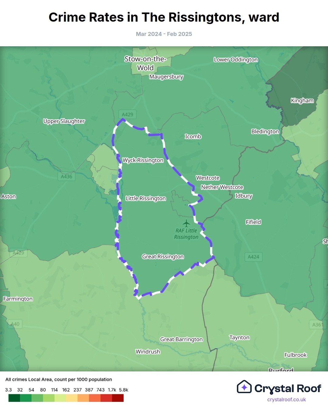 The Rissingtons (ward) is located within Cotswold (borough). Annual total crime rate in Cotswold (borough) is 58.6 crimes per thousand resident population, which can be rated as 2 out of 10 or low crime level compared to other local authority districts in England and Wales.