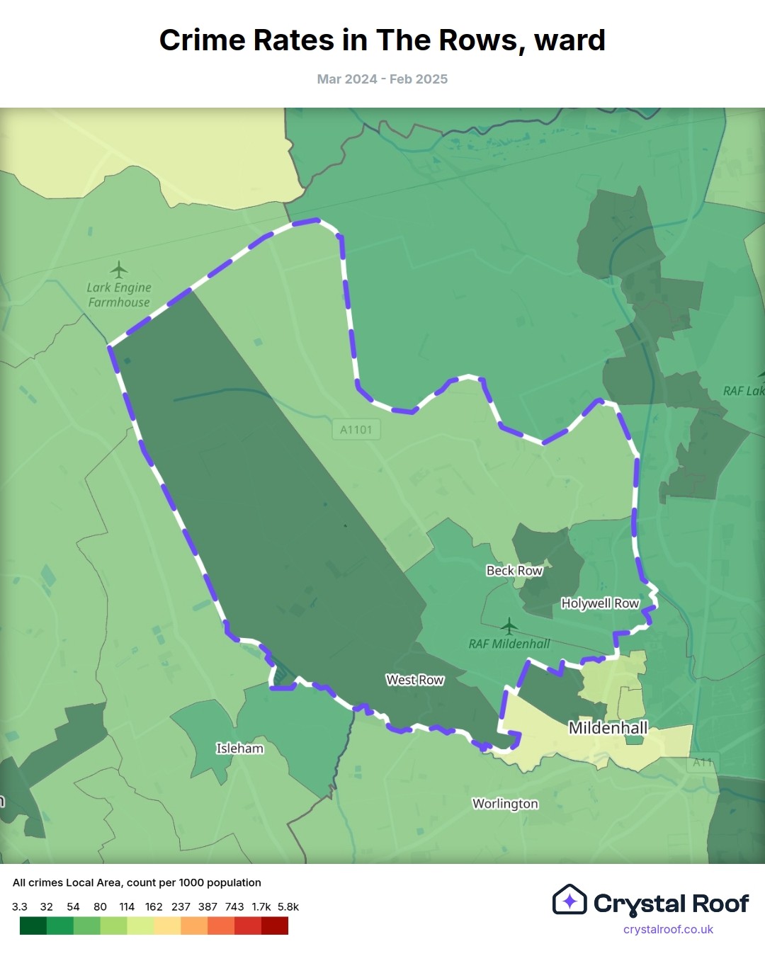 The Rows (ward) is located within West Suffolk (borough). Annual total crime rate in West Suffolk (borough) is 64 crimes per thousand resident population, which can be rated as 2 out of 10 or low crime level compared to other local authority districts in England and Wales.