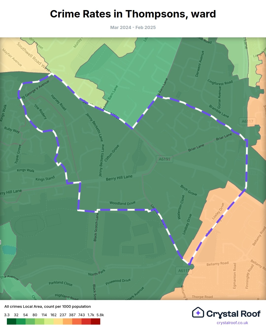 Thompsons, (ward) includes areas with the following crime ratings (see map):