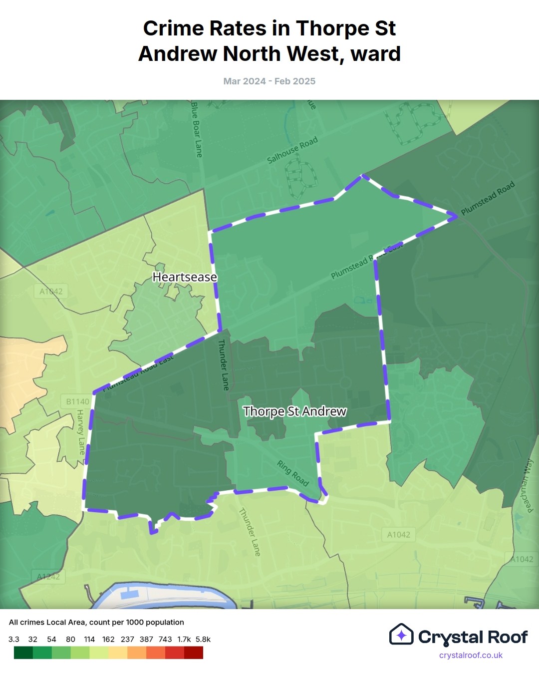 Thorpe St Andrew North West, (ward) includes areas with the following crime ratings (see map):