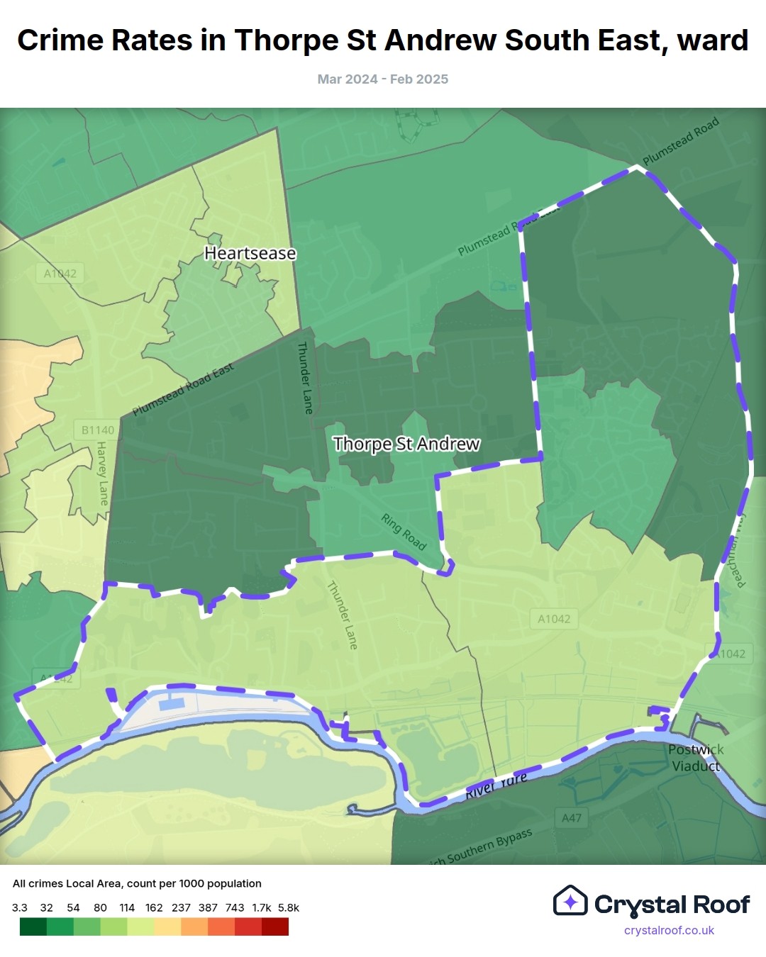 The figures in grey indicate the relative ratings of Thorpe St Andrew South East (ward) for a specific crime type compared to other wards in England and Wales.