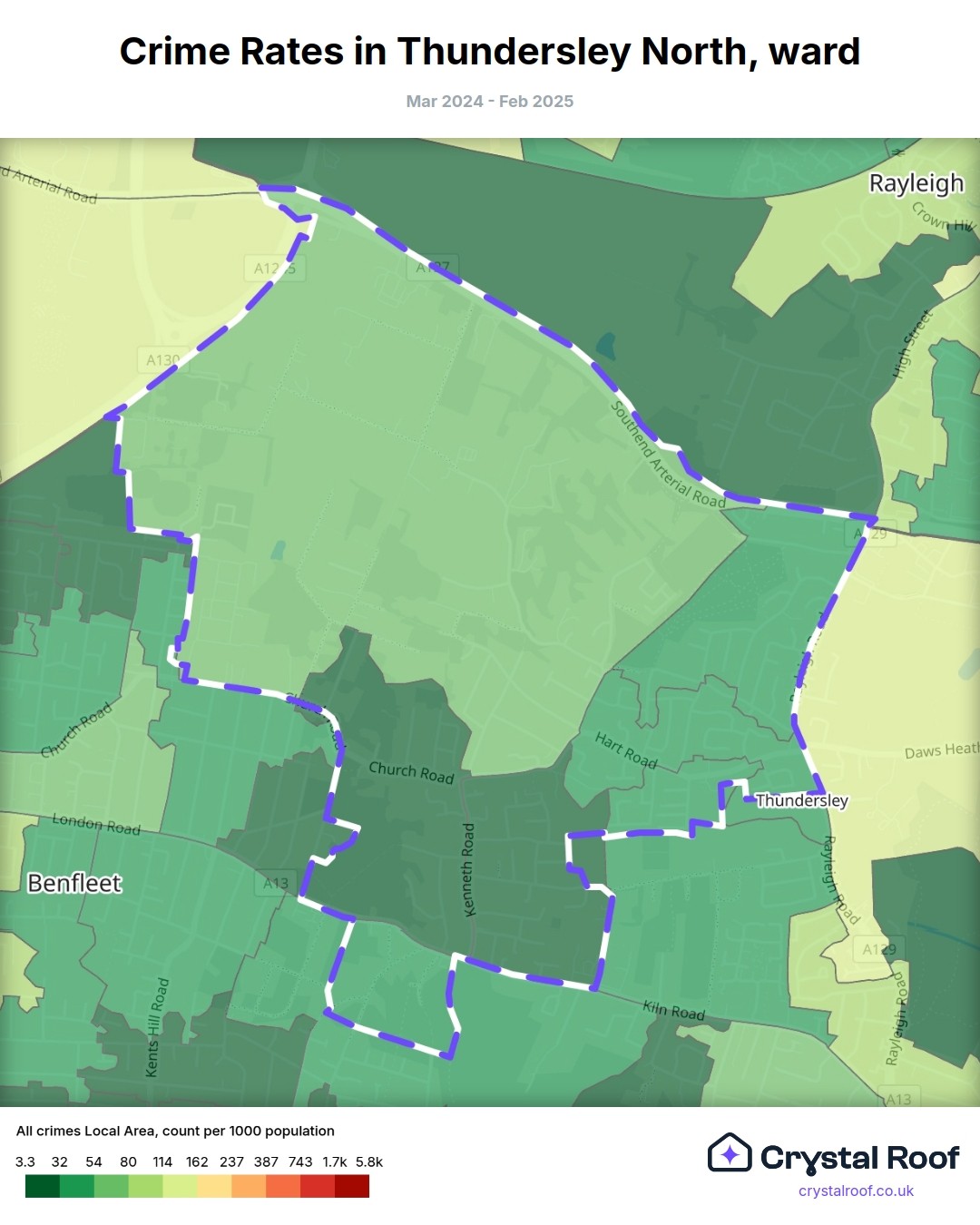 The figures in grey indicate the relative ratings of Thundersley North (ward) for a specific crime type compared to other wards in England and Wales.