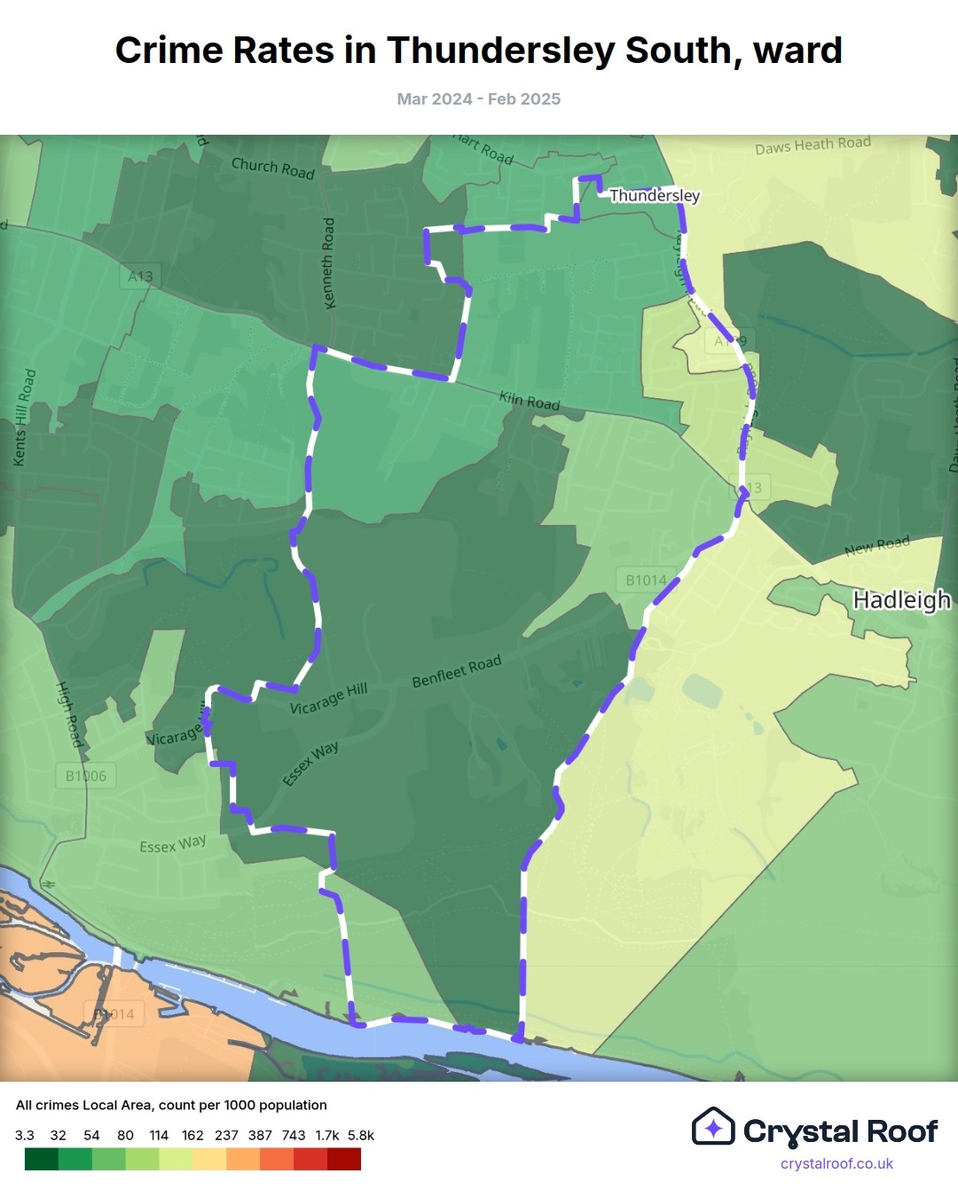 The figures in grey indicate the relative ratings of Thundersley South (ward) for a specific crime type compared to other wards in England and Wales.