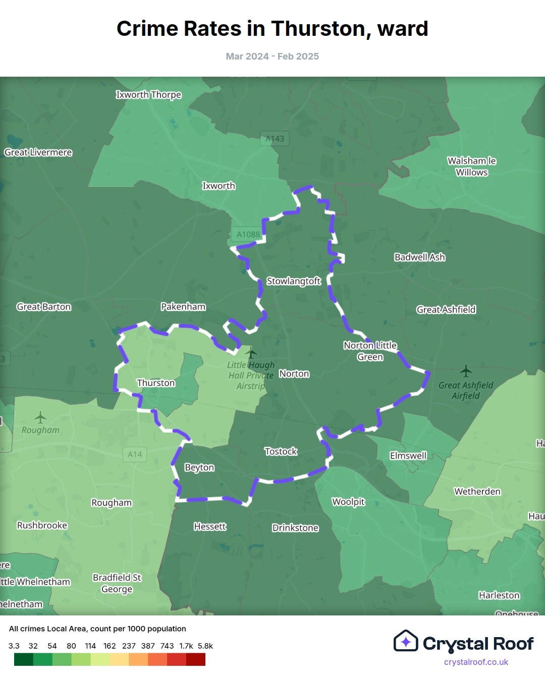 Annual total crime rate in Thurston (ward) is 55.2 per thousand resident population. This can be rated as 2 out of 10 or low crime level compared to other wards in England and Wales.