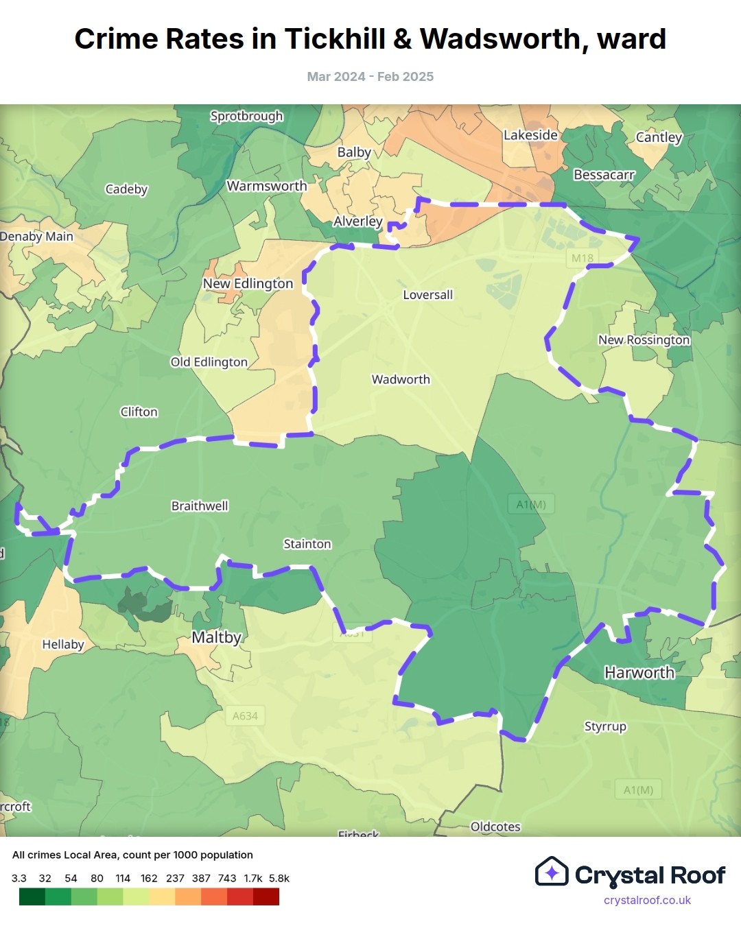 Tickhill & Wadsworth, (ward) includes areas with the following crime ratings (see map):