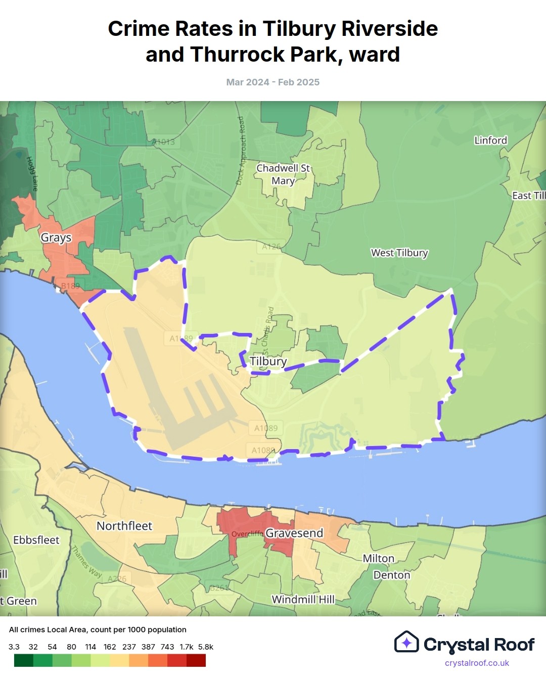 Tilbury Riverside and Thurrock Park, (ward) includes areas with the following crime ratings (see map):