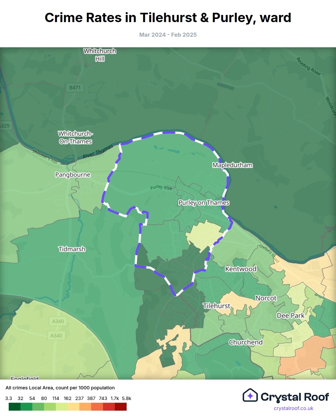 The figures in grey indicate the relative ratings of Tilehurst & Purley (ward) for a specific crime type compared to other wards in England and Wales.