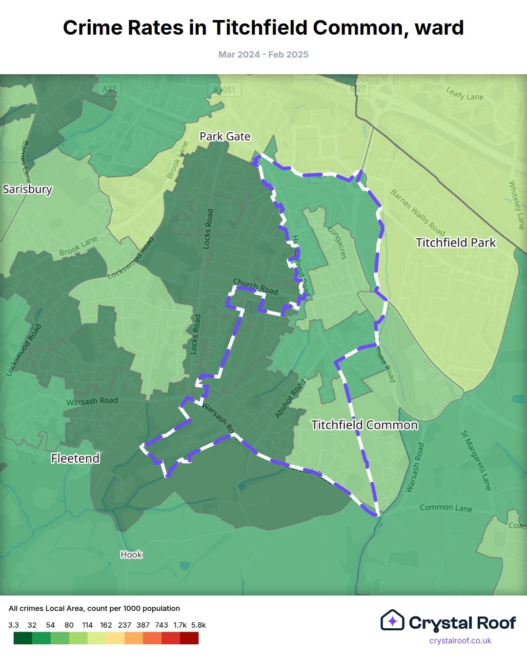 Titchfield Common, (ward) includes areas with the following crime ratings (see map):