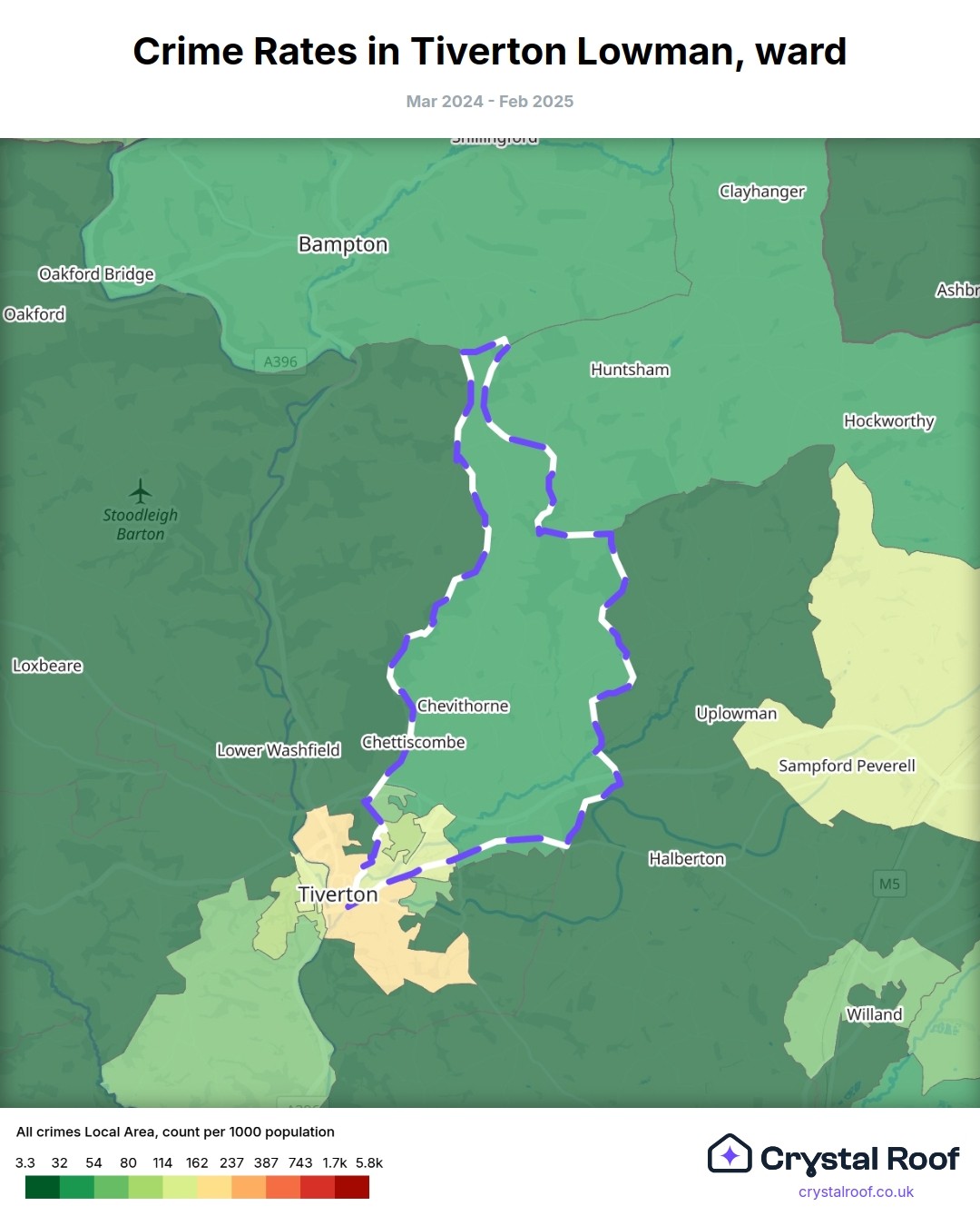 Tiverton Lowman, (ward) includes areas with the following crime ratings (see map):