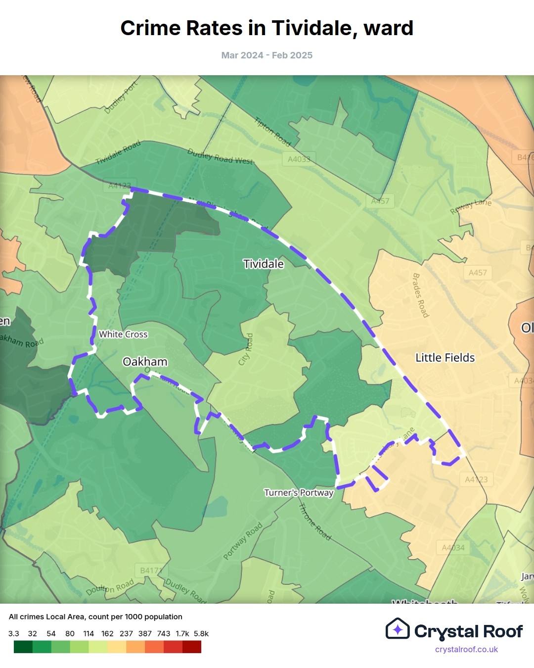 Tividale, (ward) includes areas with the following crime ratings (see map):