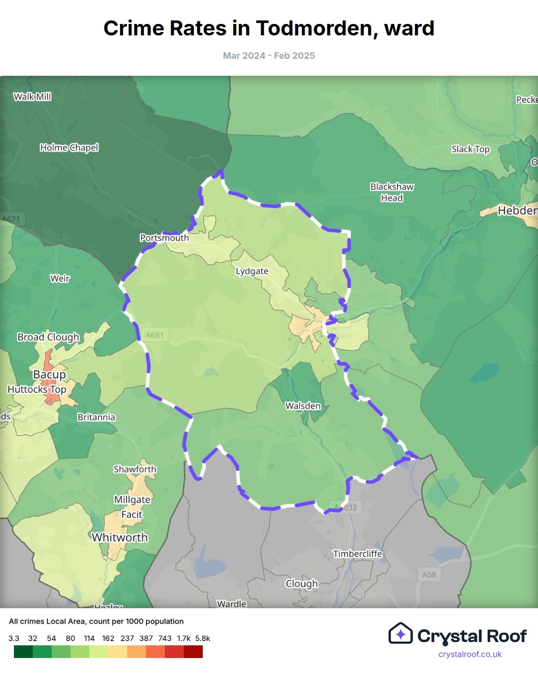 Todmorden, (ward) includes areas with the following crime ratings (see map):