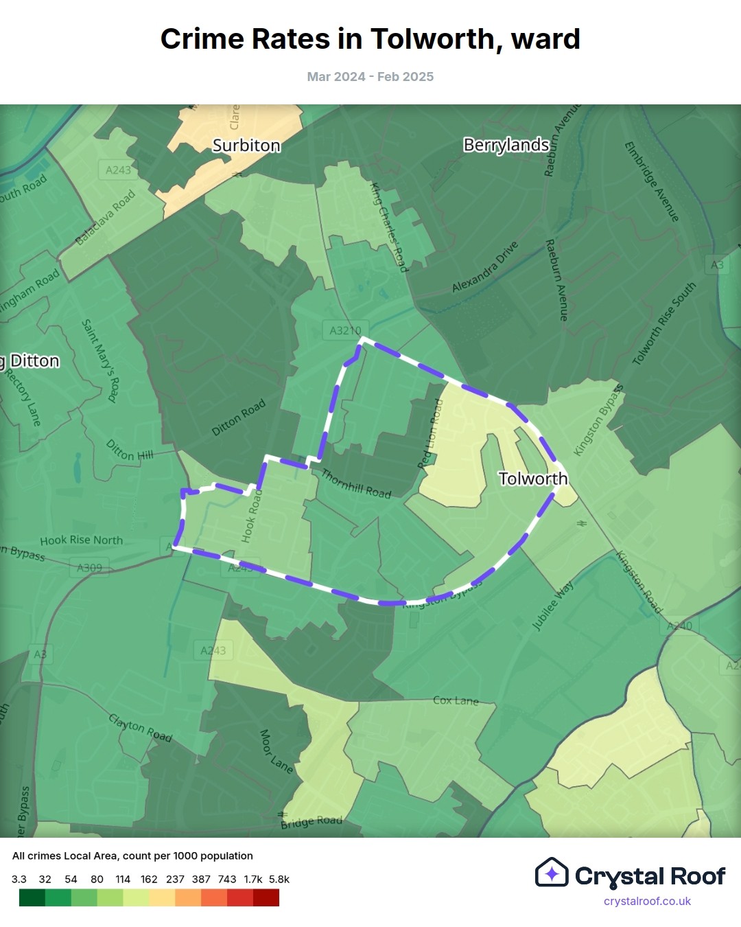 Tolworth, (ward) includes areas with the following crime ratings (see map):