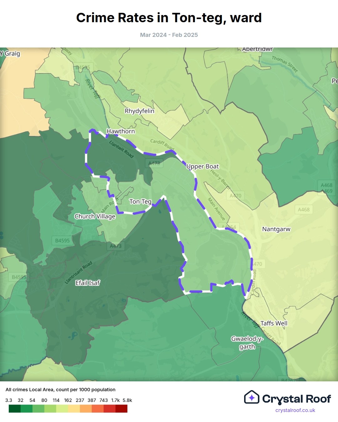 Ton-teg (ward) is located within Rhondda Cynon Taf (borough). Annual total crime rate in Rhondda Cynon Taf (borough) is 89 crimes per thousand resident population, which can be rated as 4 out of 10 or low crime level compared to other local authority districts in England and Wales.