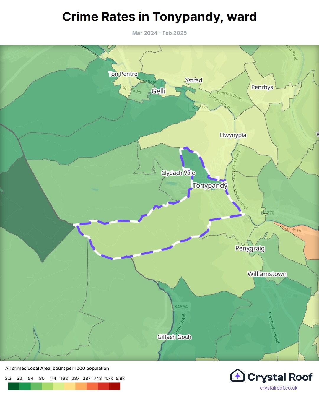 Tonypandy, (ward) includes areas with the following crime ratings (see map):