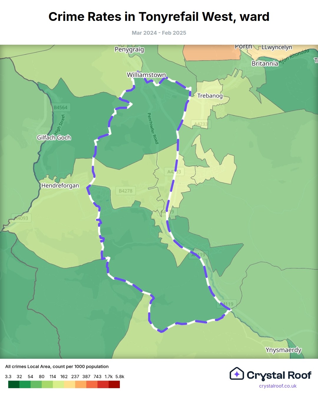 The figures in grey indicate the relative ratings of Tonyrefail West (ward) for a specific crime type compared to other wards in England and Wales.