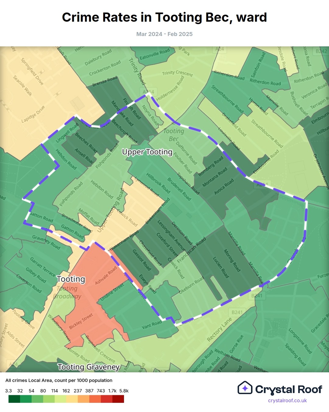 Tooting Bec, (ward) includes areas with the following crime ratings (see map):